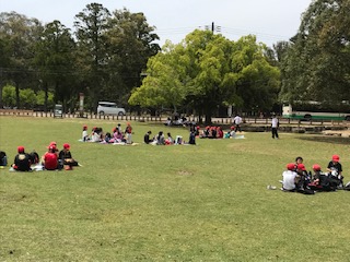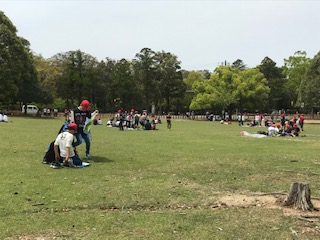 お弁当タイムです。オリエンテーリングで歩き疲れた体を休めて、楽しくお弁当を食べています。