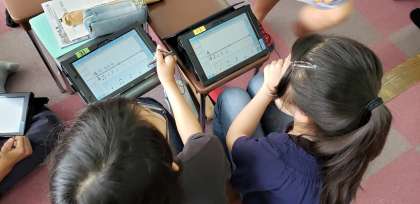 4人グループでリズムアンサンブルをつくりました。グループのアンサンブルのイメージに合わせて楽器を選び、楽器の特徴を生かしてタブレットでリズムを考えました。実際に演奏してみると、思ったよりも難しかったようです。