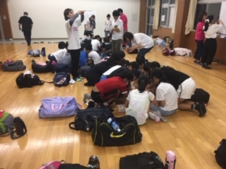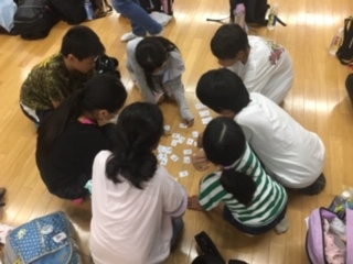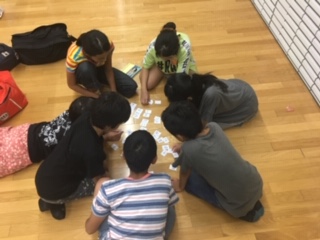 夜の集い、1つ目は、50音ゲーム。一文字一文字を組み合わせて、食べ物に関する言葉をつくります。班対抗で大盛り上がり。長い夜はまだまだ続きます。