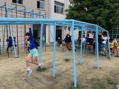 加島小学校では、10月21日(月)からスポーツ週間が始まりました。うんていや鉄棒、なわとびなど、さまざまな運動に今日は1年生がチャレンジしていました。難しい技も、みんながんばって挑戦していました!
