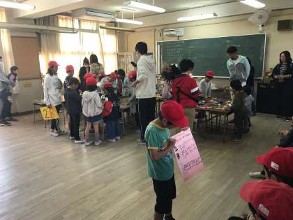 はじめの集いの後は、ファミリー班に分かれてお店めぐりです。みんなで仲よく、楽しそうにまわる姿が見られました。