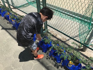 2年生は、空いている時間を見つけてミニトマトの苗に水やりを続けています。少しずつ大きくなってきて、成長を楽しみに自分の植木鉢を見ています。