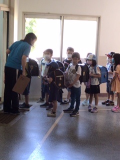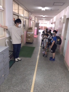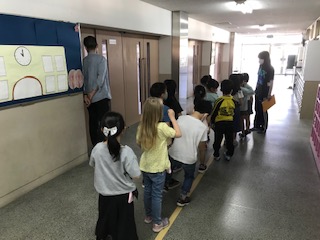 担任の先生といっしょに、1階の部屋を見て回りました。職員室や保健室、講堂はわかったかな?