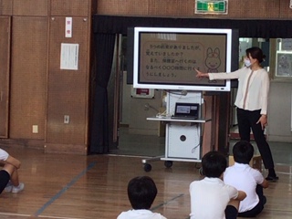最初は、6年生の2測定です。測定前に、保健室の田中先生から保健室の使い方についてお話がありました。新型コロナウイルス感染症拡大防止のために、これまでとは違う保健室の使い方になります。