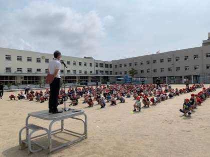 始業式は人との間隔を空けて、運動場で行いました。