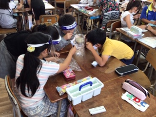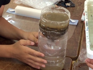 砂や石の粒の大きさと水の浸みこみ方の違いを調べる実験をしました。