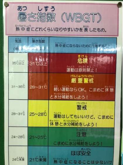 子どもたちには、暑さ指数(WBGT)を使って、職員室前の掲示板や運動場に置くオレンジ色や赤色のコーンで子どもたちに警戒を知らせています。「厳重警戒」の予報が出たときには、運動場での活動は帽子をかぶり、のどが渇く前に水分補給するように呼び掛けています。また、「危険」の予報が出たときは、運動場での活動を禁止しています。
