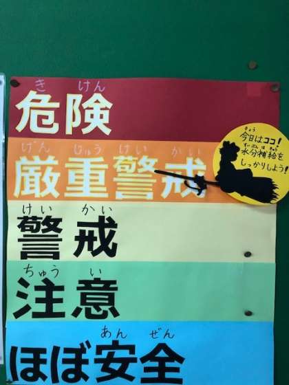 今日も12時から「厳重警戒」の予報が出ています。子どもたちには担任からしっかりと指導してまいりますが、ご家庭でも熱中症予防について子どもたちと話し合っていただけると有難いです。環境省に熱中症予防情報サイトがありますので、ぜひご覧ください。