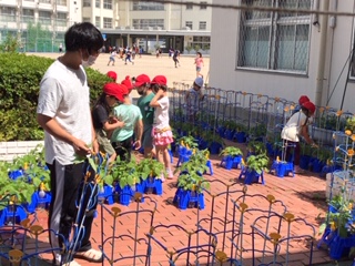 「つるがまきついてる!」「葉っぱがいっぱい!」「もう咲くかな?」