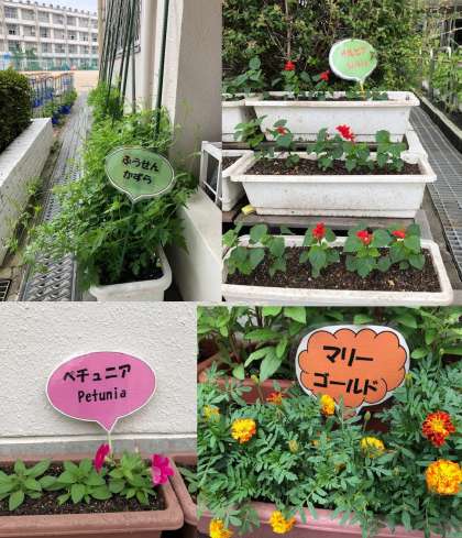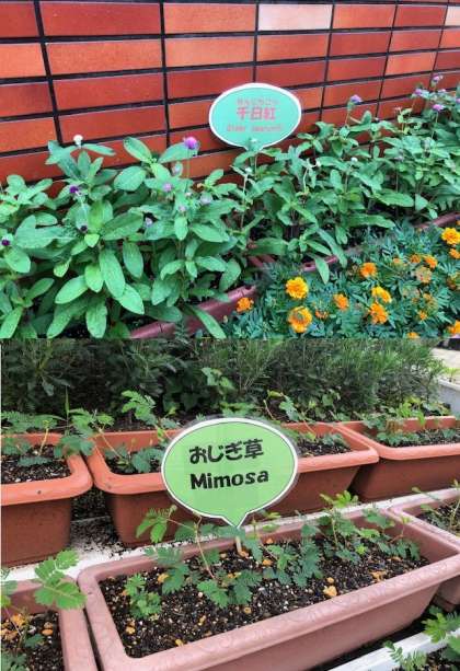 千日紅(せんにちこう)・おじぎそう・ふうせんかずら・サルビア・ペチュニア・マリーゴールド・あさがお。これらは、管理作業員さんが種から丁寧に育てて植えてくださったものです。