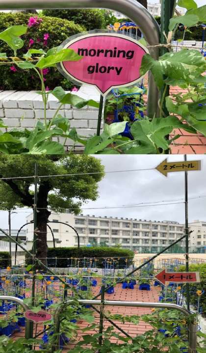あさがおは、ぐんぐん伸びて現在1mまで届いています。早く2mまで伸びるといいな。英語での表記があったり、長さの表示があったり・・・。いろいろな教科の勉強にもなっています。