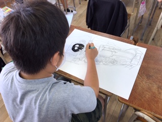 それぞれの工夫をした構成の下絵を終え、絵の具での色付けが始まりました。
