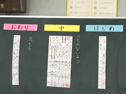 家でしていることを友だちに伝える文章を書きました。 友だちがわかりやすいように、「はじめ・なか・おわり」と文章の組み立てを考えました。