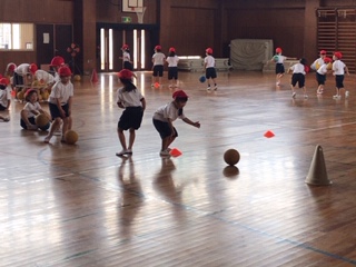 ボール運動では、ボールを地面についたり、転がしてコーンに当てたりしました。
