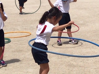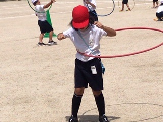 フラフープもしました。上手に回せる人もいましたが、今はできない人も友だちにコツを聞きながら一生懸命練習していました。