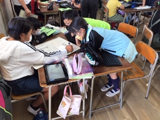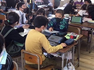 社会科の学習で柏原市のぶどう作りについて調べてきました。今度はそのことを発信する活動です。最終的にはポスターを作りますが、今日はポスターに載せるキャッチコピー作りです。伝えたいことを印象的な言葉で表現できるように考えます。グループで相談して決めていきます。