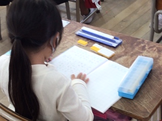 子どもたちは落ち着いて、繰り上がりのある足し算の問題に取り組んでいました。