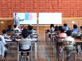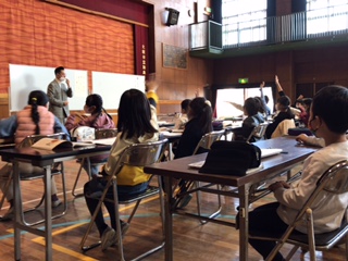 教員研修の一環で多くの先生が授業参観をする関係で、3密を避けるため講堂での授業となりました。