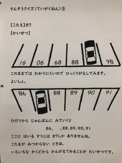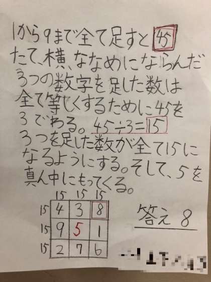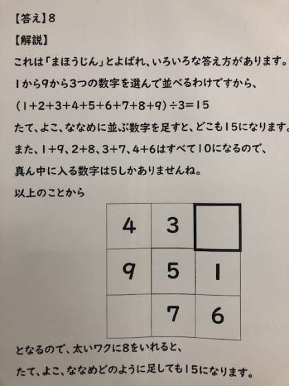 中学年の問題の正解者は26名。「まほうじん」は少し難しかったでしょうか。わかりやすく考え方を書いてくれた児童がいましたので掲載します。