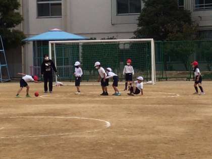 転がしドッジボールでは、円のコート内を一生懸命逃げていました。