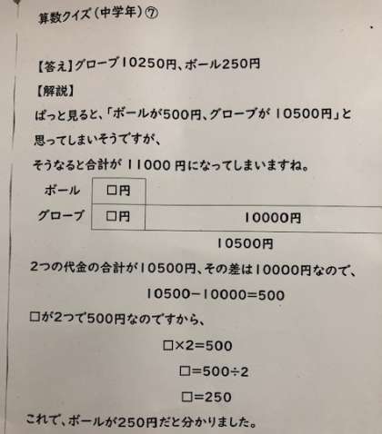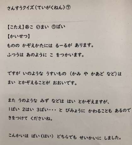 算数クイズ第7弾の答えの発表がありました。冬休みに親子で一緒に考えてもらったような解答用紙もありましたね。(*^^*)