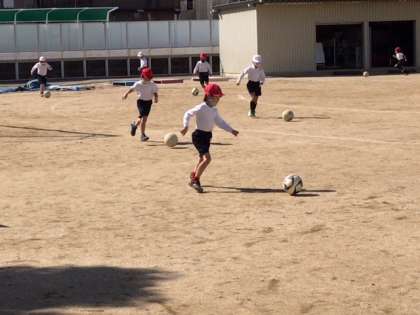 サッカーボールを上手にドリブルしながら運動場を走ります。