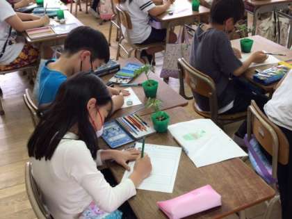 育てている苗を観察して、観察カードに絵や文で記録しました。
