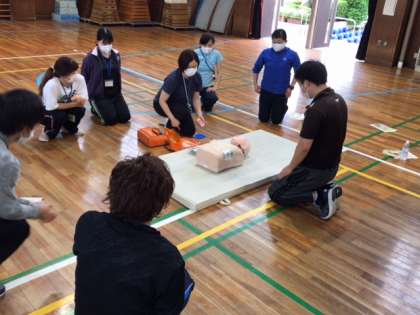 6月の水泳学習に向けて、心肺蘇生法やAEDの使い方の研修を行いました。
