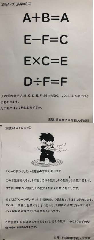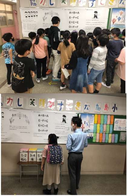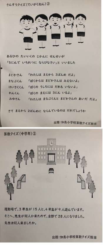 雨のため運動場で遊べなかったこともあり、たくさんの子どもたちが、算数クイズの貼り出された掲示板の前に集まり、一生懸命問題を解いていました。
