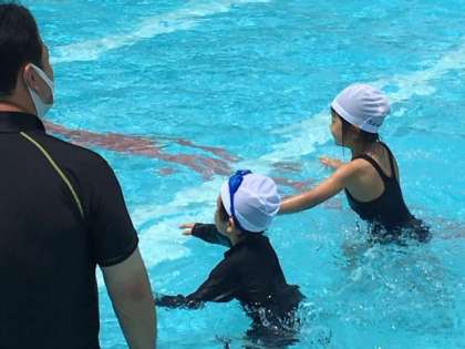 今日は、水の中でいろいろな動きをしたり、歩いてみたり、ちょっぴり顔をつけたりにも挑戦しました。