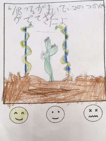 立てた棒にくるくると上手に巻き付いていくつるの様子に、子どもたちもびっくり、嬉しそうです。