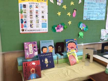 今日は、図書館補助員さんに来ていただいている日です。図書室の掲示物やレイアウトなども工夫していただいています。
