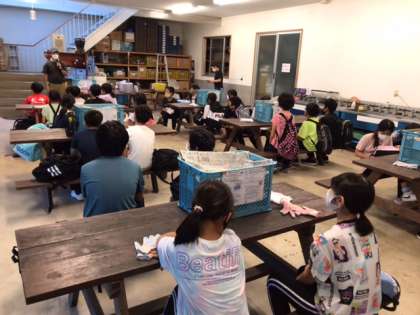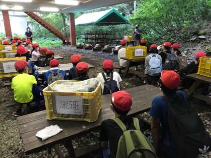 今は降っていませんが、雨天のことも考慮して、1組と2・3組に分かれて屋根のある所で活動します。