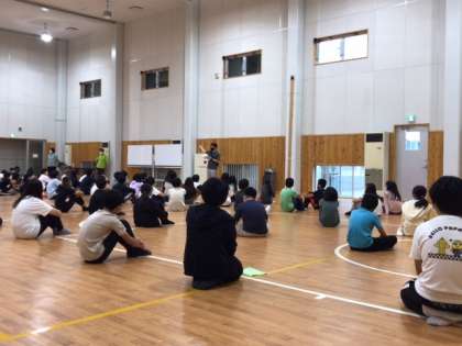残念ながら、現在雨が降っています。朝の集いは体育館でおこないました。