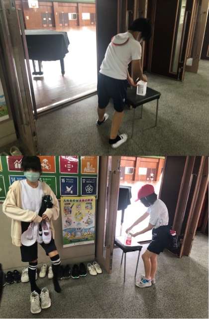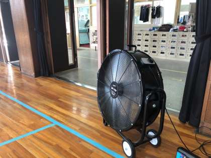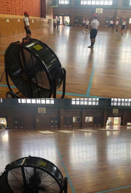 体育館では、マットや跳び箱、ボールなど共用するものが多いので、授業前後の手洗い(消毒)を徹底しています。また、すべての扉を開放し、昨年度購入した大型扇風機3台で常に換気をしながら授業を行っています。