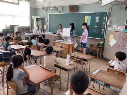 ペア学年間での交流をするため、今日は6年生が1年生の教室にクイズを出題しにやってきてくれました。