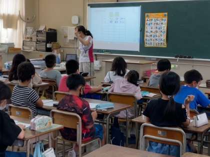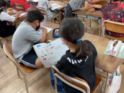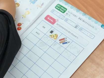 「What 〜 do you like?」の表現の型を使って、好きな食べ物、色、スポーツを相手に聞いたり、聞かれたことに、「I like 〜」で答えたりする練習をしました。
