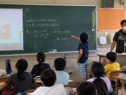 120円のジュース1本と90円のパンを3こ買った時の代金を求めます。