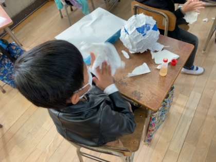 膨らませた風船に、くしゃくしゃにした紙をちぎって糊をつけて貼っていきます。