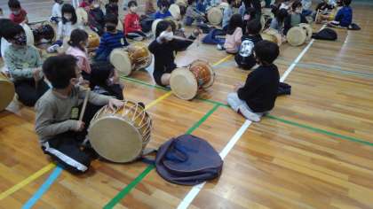 そして、全員で実際に楽器を触って音を出してみました。みんなで合わせながら4つのリズムを演奏しました。少しずつ音も合ってきて、みんな楽しそうに太鼓を叩いていました。