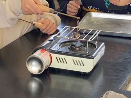 金属を温めると体積は変わるのか。コンロで鉄球を温めて鉄球の大きさを調べます。