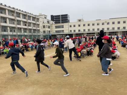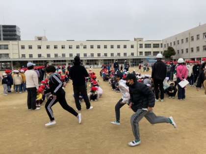 地震がおさまった後、運動場に避難します。その後、津波が発生する情報があれば、校舎の3階以上に避難します。