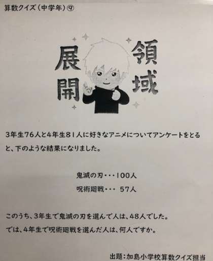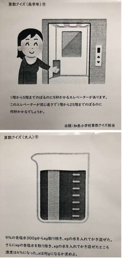 連続で算数クイズです。もう締め切りを過ぎてしまい、答えが職員室前の掲示板に張り出されています。応募はできませんが、お家でご家族一緒に考えてみてくださいね。答えは、後日掲載いたします。