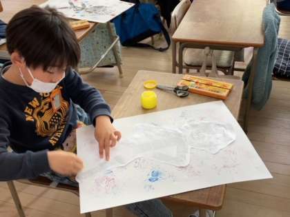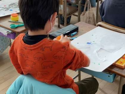 紙版画の作品完成に向けて最後に画用紙に貼っていきます。