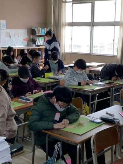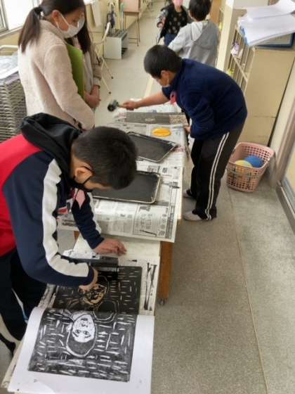 彫り終えた人は印刷作業です。友達と協力しながら丁寧に刷っていました。