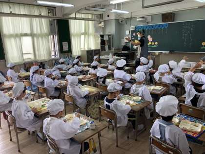 今日から給食が始まりました。1年生は、はじめての給食です。6年生が各学級に食器などを運ぶお手伝いにきてくれました。3学級とも静かに給食を食べていましたが「おいしい〜!」という心の声が聞こえそうなくらいおいしそうに食べる姿が見られました。中にはおかわりをする子もいましたよ。