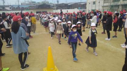 1年生を迎える会で、1年生がはじめて他の学年の児童と対面しました。
