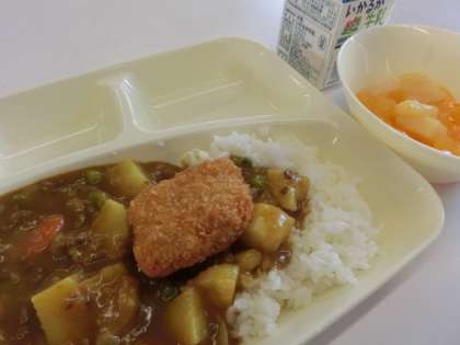 「カツカレーライス、フルーツゼリー、ごはん、牛乳」です。