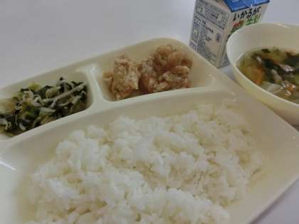 4月21日(木)の献立は「鶏肉のからあげ、中華スープ、チンゲンサイともやしの甘酢あえ、ごはん、牛乳」でした。