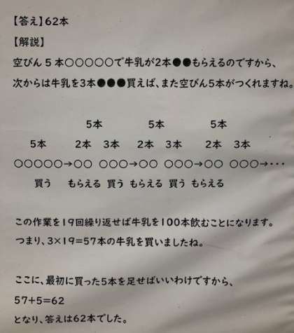 大人クイズの正解者は8名でした。空きびん問題・・・楽しいですね。いろいろ応用して問題作りもできます。補足で「102本飲める」と求めてくださったのは素晴らしい!!!